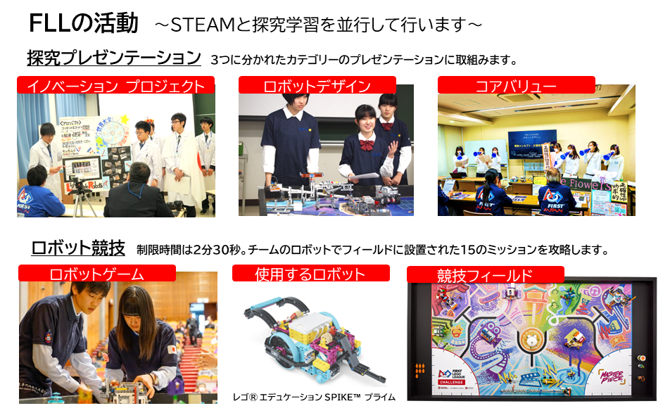 FLLの活動は世界が直面する社会問題の解決に取り組む「探究プレゼンテーション」と「ロボットゲーム」で構成されます。「探究学習」と「STEAM」を並行して学べることが特長です。「探究プレゼンテーション」では、SDGsの17の目標に親和性のある大会テーマをチームで探求しその解決策を審査員の前でプレゼンテーションします。今シーズンのテーマは「アート(芸術)」で、アートにテクノロジーや工学が加わるとどんな世界が広がるかを探究するテーマになっています。「ロボットゲーム」ではレゴ社のロボットキットを組み立て、プログラミングをし、制限時間150秒間でフィールドに設置されたミッションをいくつ攻略できるかを競う競技に挑戦します。