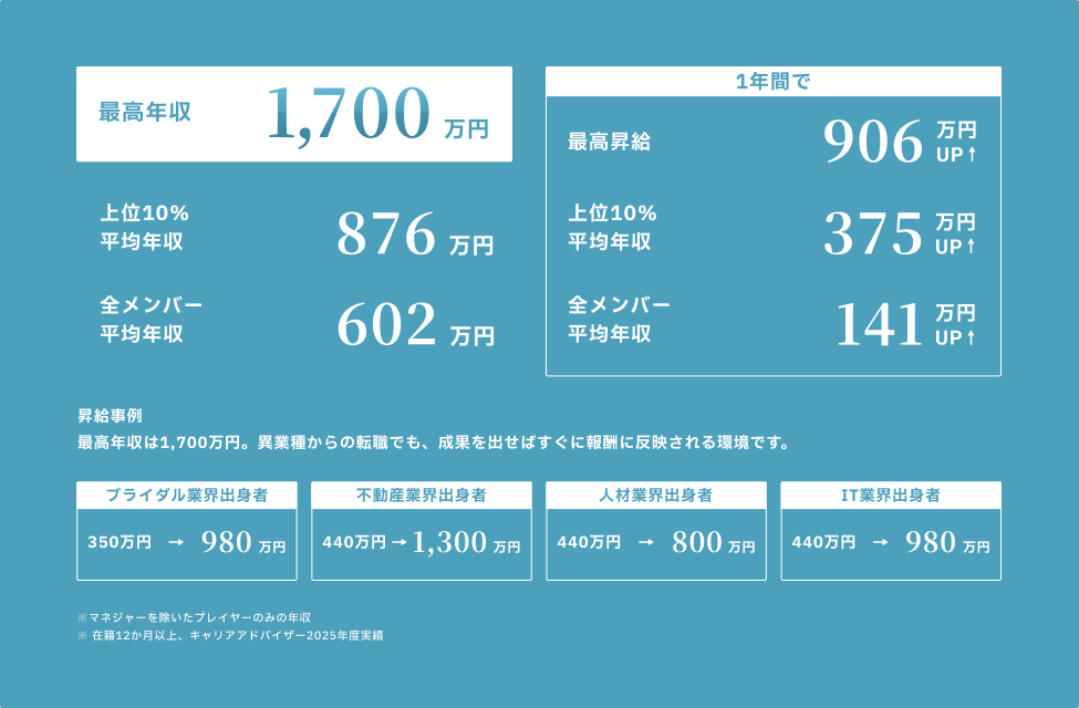 キャリアアドバイザー職の最高年収は1,700万円、上位10%の平均年収は876万円と、業界最高レベルの水準です。プレックスでは絶対評価を用いていて、目標達成ごとの昇給金額が決まっており、達成した人は全員昇給となります。