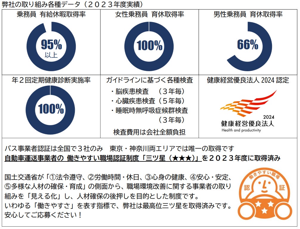 業界最高水準の初任給引き上げと在籍従業員の賃金引き上げを実施し、昨年度比3倍の乗務員採用を目標として、採用促進に向けた取り組みを強化します(働きやすい職場認証制度「三ツ星」取得済み)