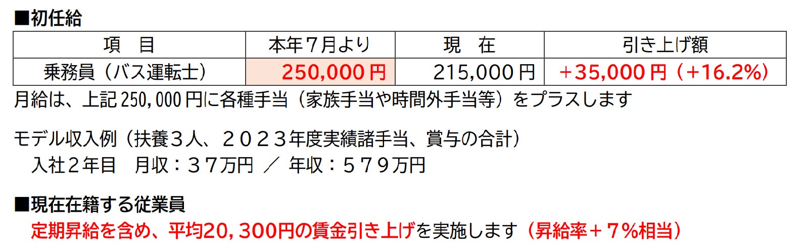 乗務員の初任給ならびに在籍従業員の賃金を以下のとおり引き上げます。