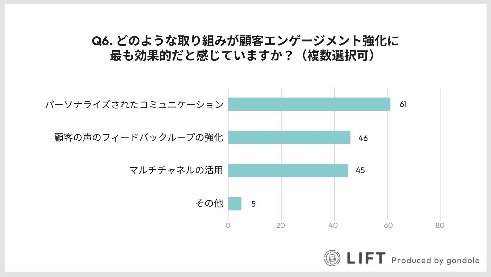 パーソナライズされたアプローチが特に高く評価されている一方で、マルチチャネルの活用や顧客のフィードバックループを強化することも、エンゲージメントを深めるための有効な施策とされています。企業がこれらの取り組みを統合的に実施することで、顧客満足度の向上と長期的な関係構築が期待されます。