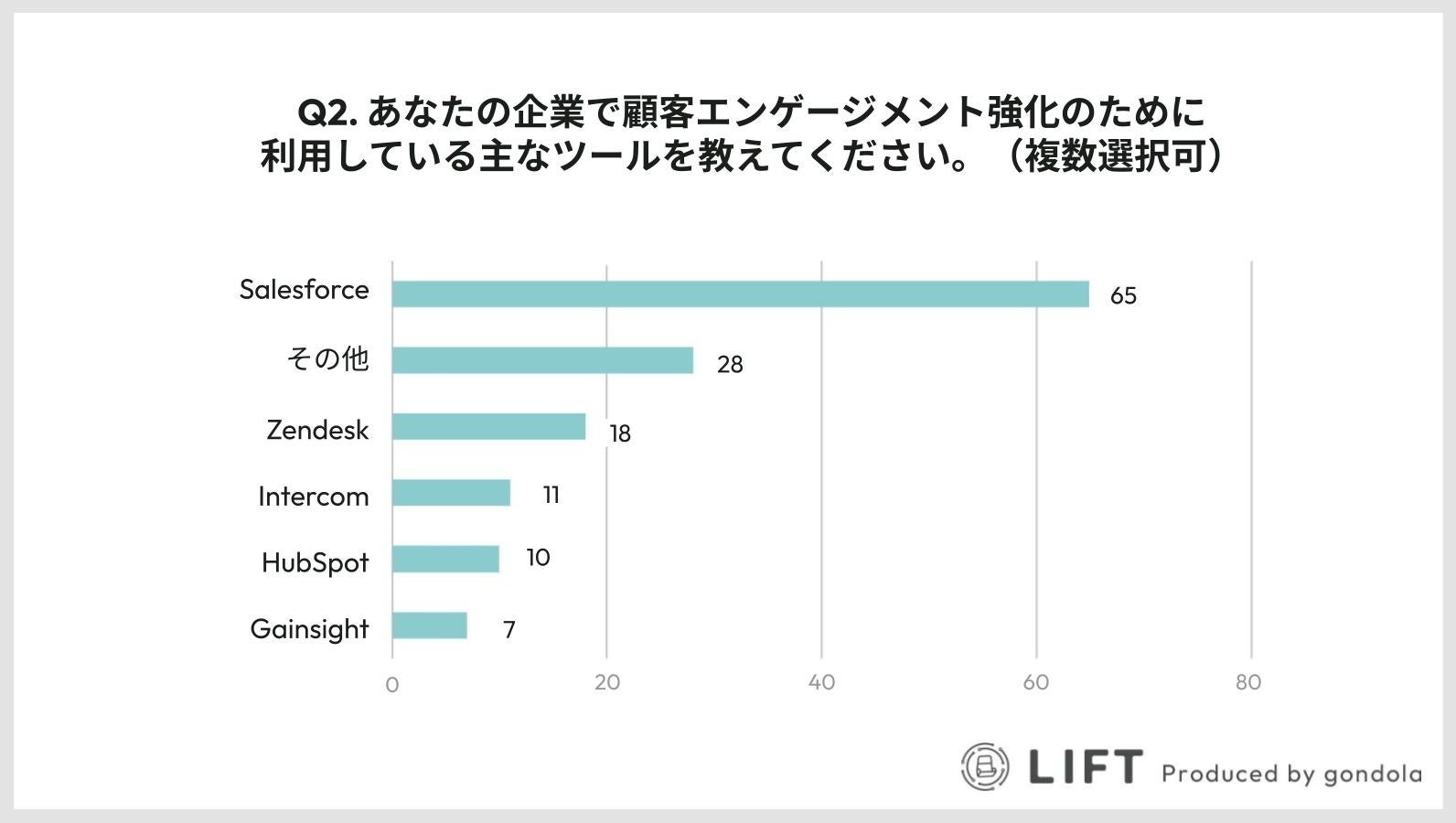 顧客エンゲージメント強化のために自社で利用している主なツールの調査に対する結果では、Salesforceが55.1%と最も多く利用されており、続いてZendeskが15.3%、Intercomが9.3%、HubSpotが8.5%、Gainsightが5.9%となっています。この結果から、企業の顧客エンゲージメント強化のアプローチにおいて特定の傾向が見えてきます。