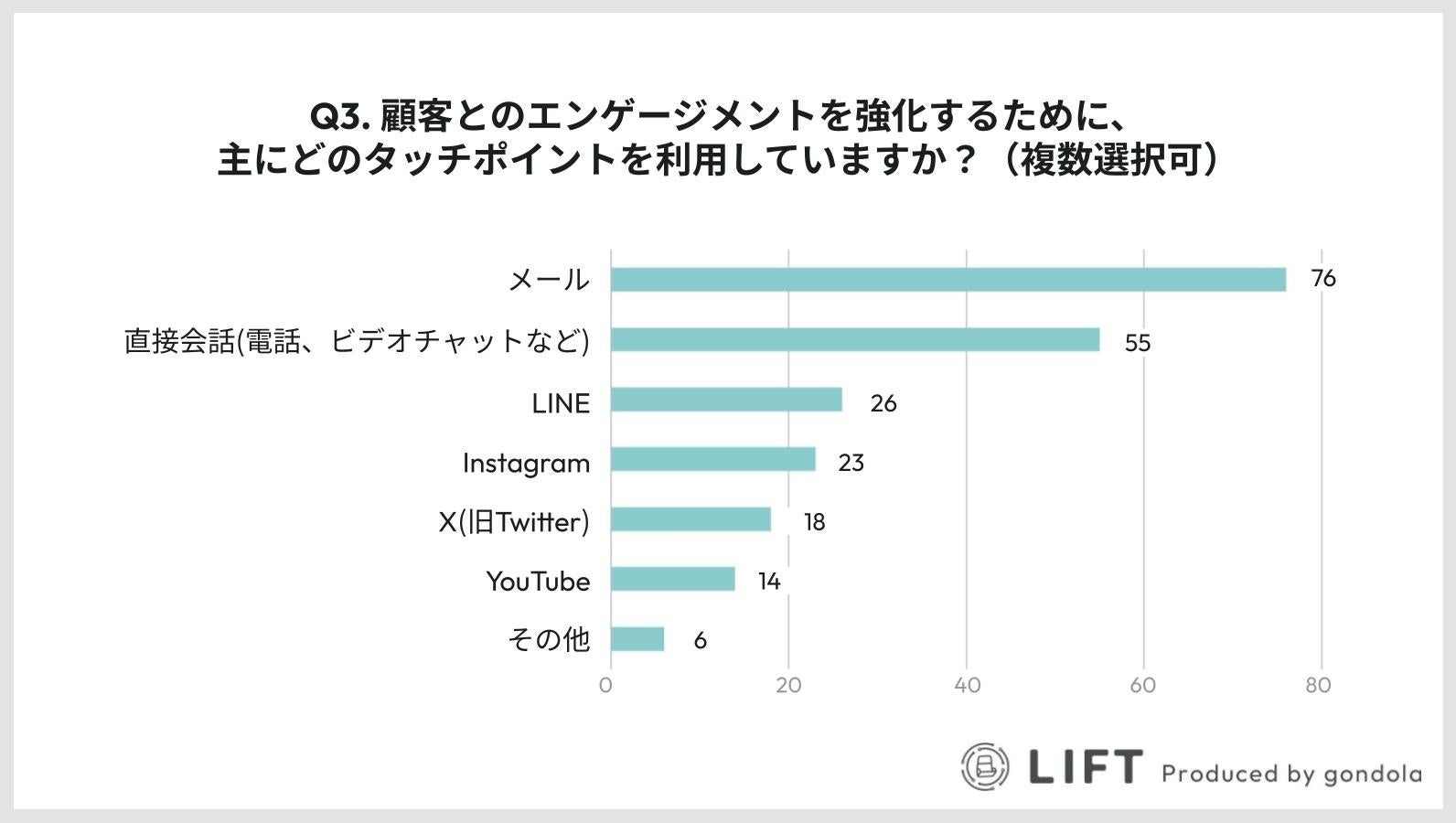 メール(64.4%)が最多となっている点は、依然としてメールが顧客とのエンゲージメント強化における主要チャネルであることを示しています。メールは費用対効果が高く、個別対応やパーソナライズが比較的容易に実現できるため、顧客との継続的な関係を構築するために多くの企業で活用されています。