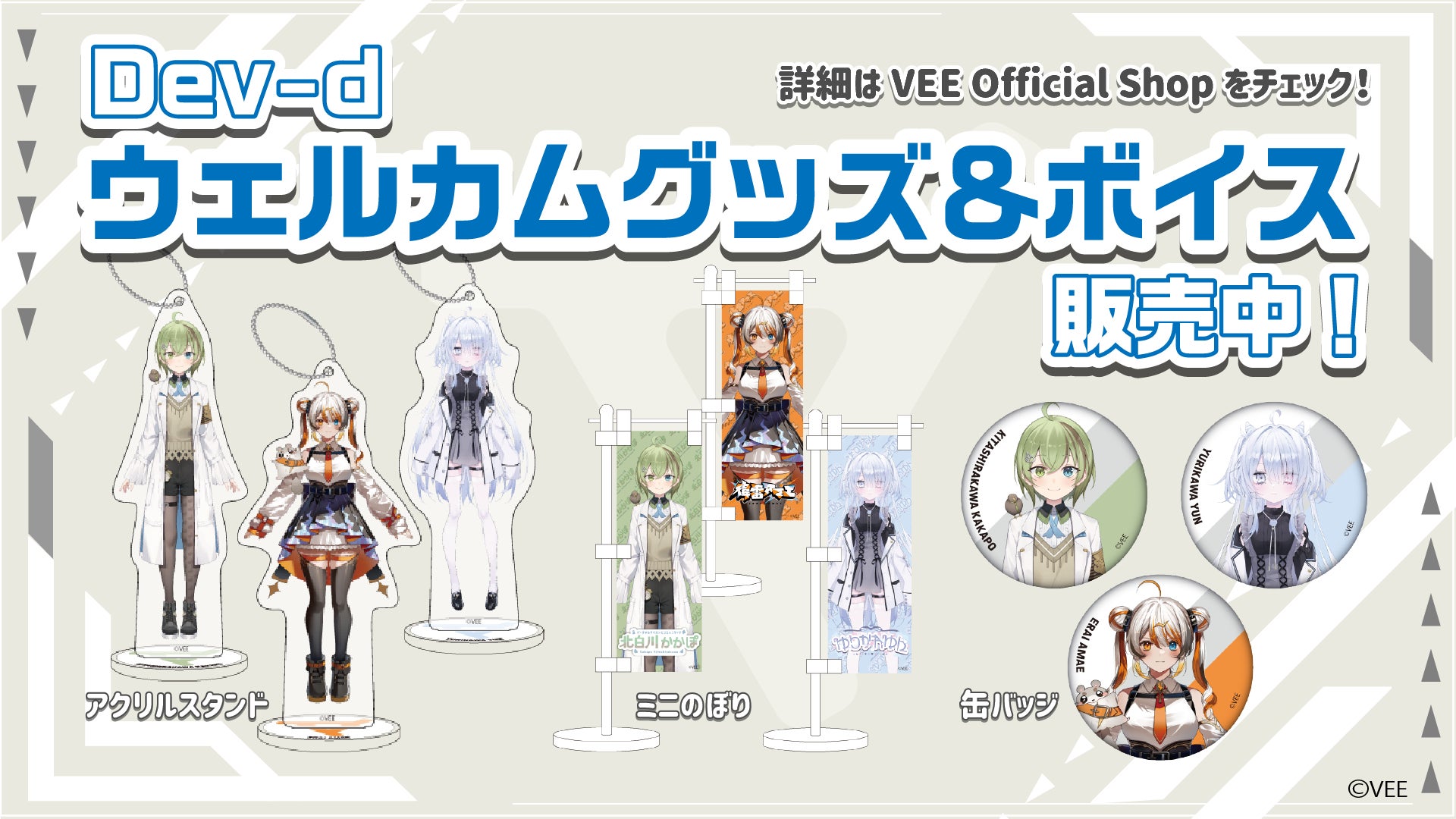 Dev-dのウェルカムグッズとして、缶バッジ、アクリルスタンド、ミニのぼりが登場!ウェルカムボイスとともに、公式オンラインショップ「VEE Official Shop」にて販売!