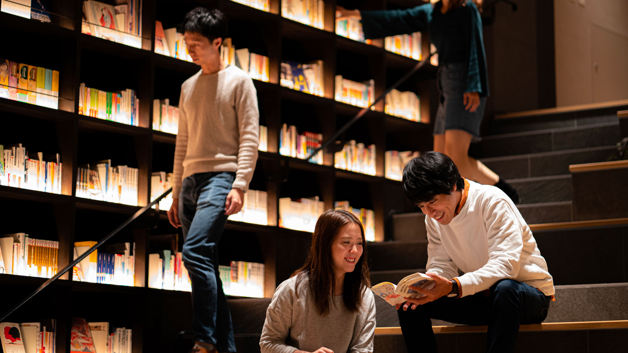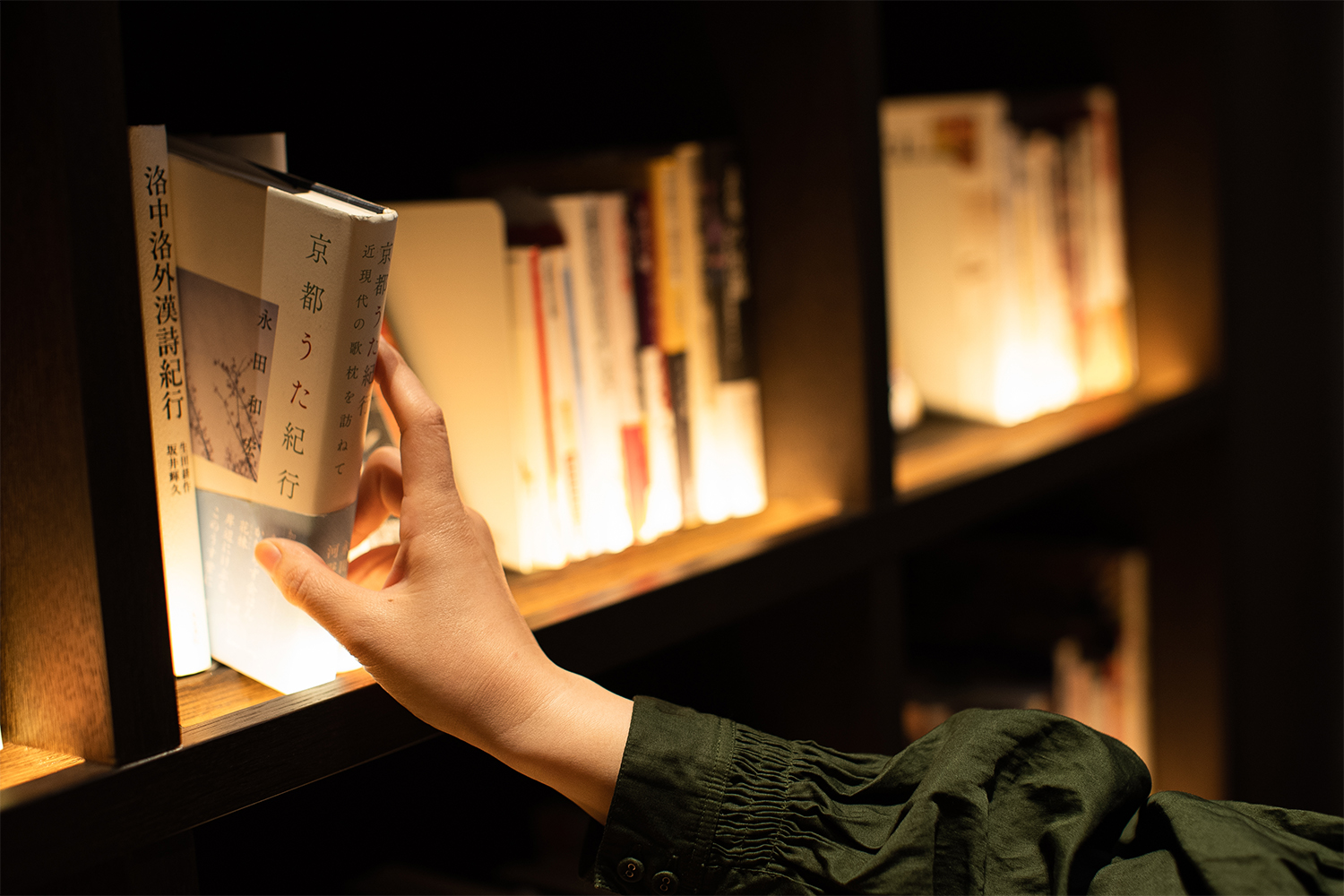 本棚の前には大階段があり、そこに腰掛けながら好きな作家の本を読んだり、本に登場する京都の場所を他の本で確認しながら読んだり、思い思いの様々な楽しみ方をしていただけます。大階段下には大きなソファもあり、くつろぎながら読書していただくことも可能です。24時間閲覧できるので、時間を忘れて気付けば真夜中なんてことも。