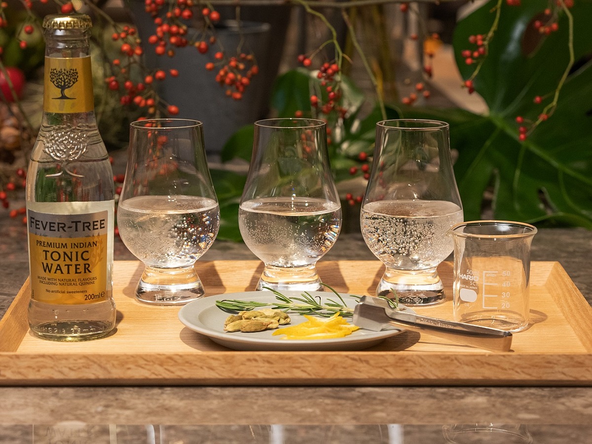 ここでの楽しみは、なんといってもオリジナルのジントニックが作れる、テイスティングセット。お好きなジン3種類、トニックウォーター、ガーニッシュをお選びいただき、ご自身で作っていただくスタイルです。次々に起こる、味の変化をお楽しみください。