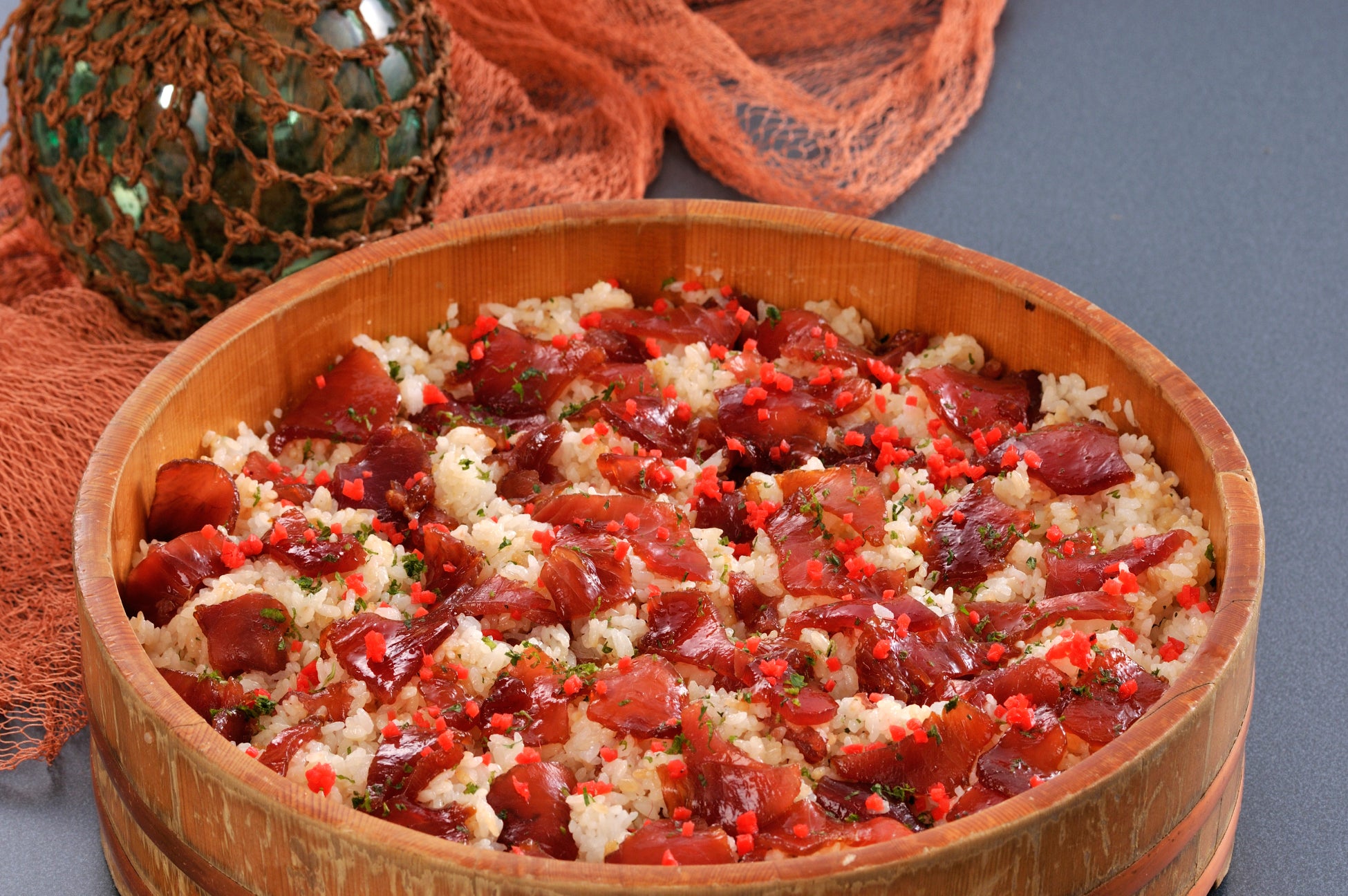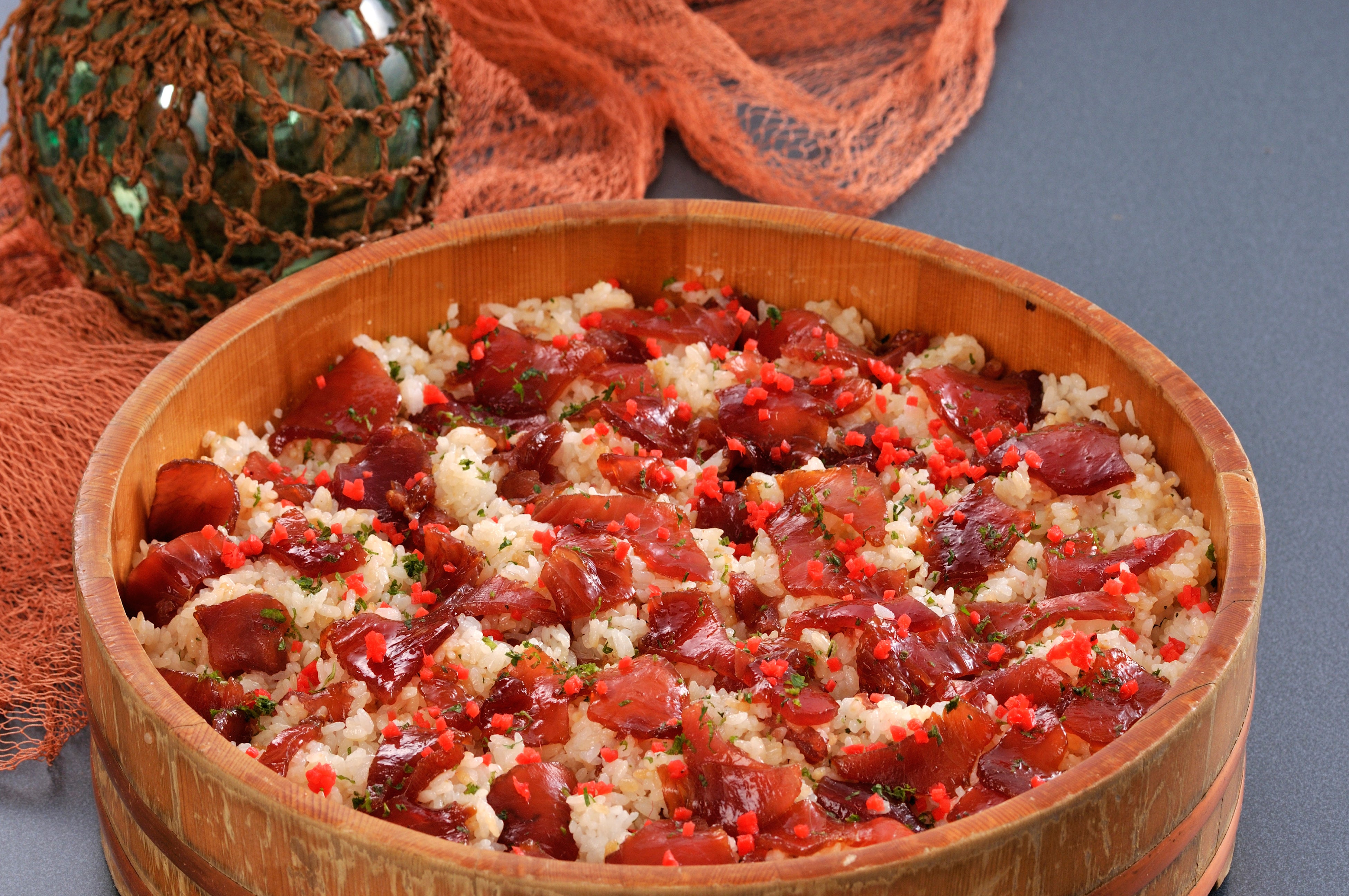 志摩を代表する名物「てこね寿司」は、古くから漁業が盛んな志摩市志摩町和具の漁師が、かつお船に乗って一本釣りでかつおを獲り、忙しい漁の合間に船の上で食事をとる際に、かつおを刺身にして醤油に漬け、ご飯に混ぜて手軽に食べたのが始まりで、手でこねて作ったことから「てこね寿司」と言い伝えられている漁師の料理です。