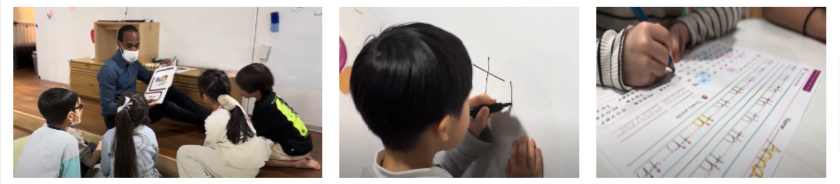 特に小学校入学期は、文字や数字の認識力の成長が著しい時期なので、正しい発音を身につける、自力で単語を読む、単語の音からスペルを書き起こす、さらに、質問に対して単語ではなくセンテンスで返すことにも挑戦し、活きた英語、使える英語、話せる英語に取り組みます。