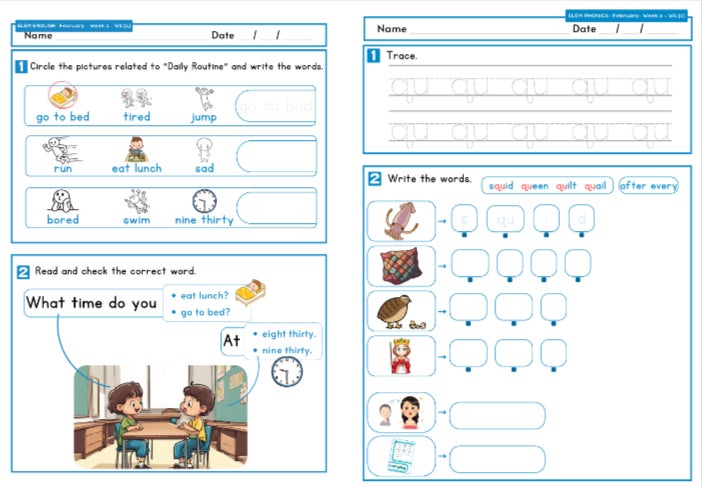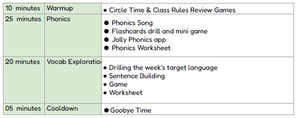 週のターゲットボキャブラリーは3〜5ワード、テキストベースでなく『ワークショップ形式』、充分に発音を繰り返したあと、発音と文字の組みたて等をペーパーで確認していきます。