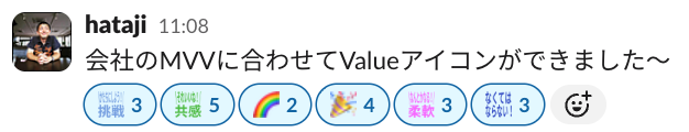 いつも利用しているアイコンジェネレーターを使い、「それいいね!」「なんとかなる!」「かたちにしよう!」といった各Valueに対応したカスタム絵文字をスピーディに作成。現在では、日常のやり取りの中で自然と使われ、社員同士の会話の中を行き交っています。