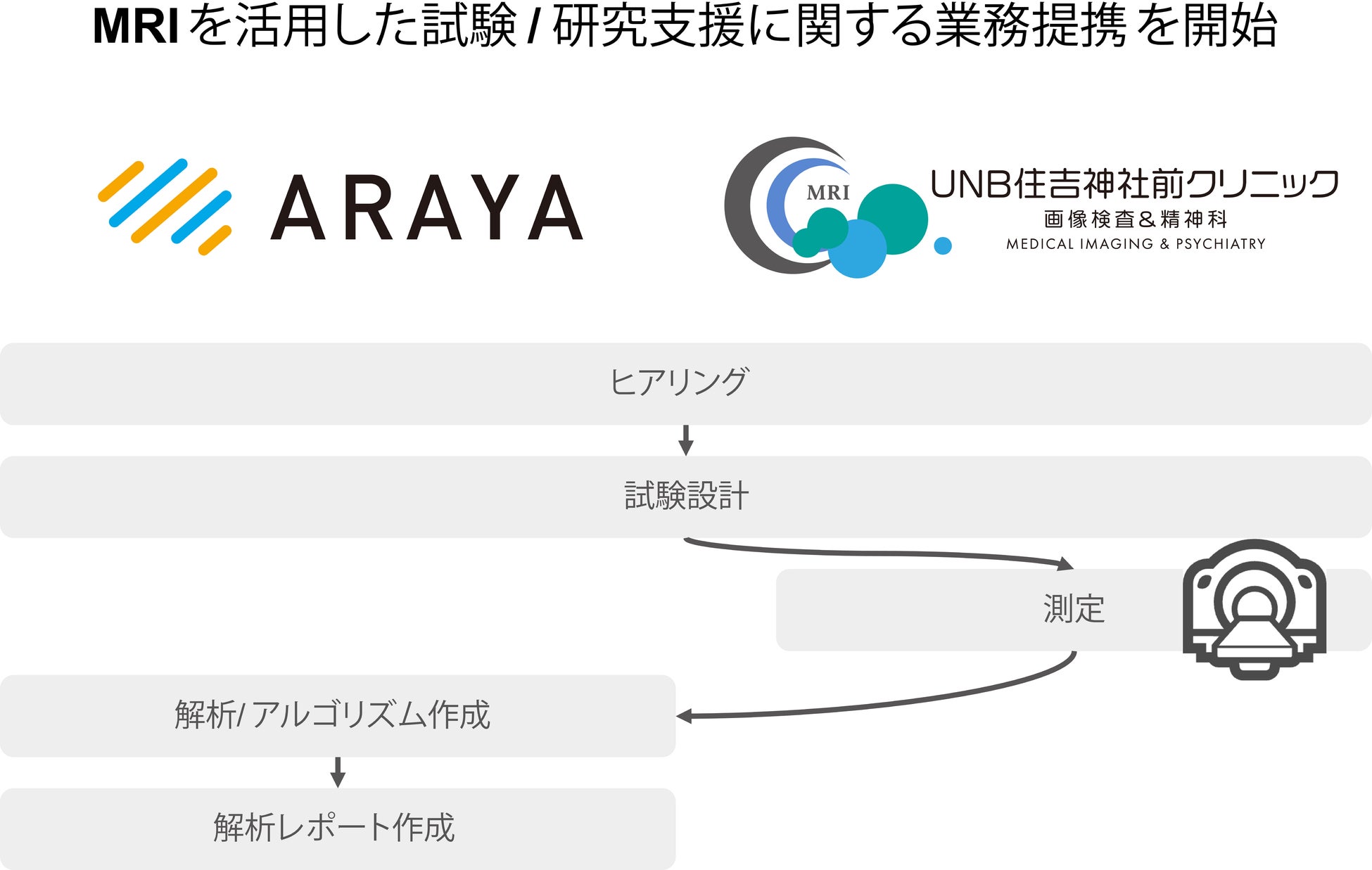 アラヤと一般社団法人日本精神神経画像センターが運営するUNB住吉神社前クリニックの提携により、お客様はご自身の検証したい内容をお持ちいただくだけで、MRIを活用した試験に必要な試験設計からレポート作成までのサポートを受けることが可能です。