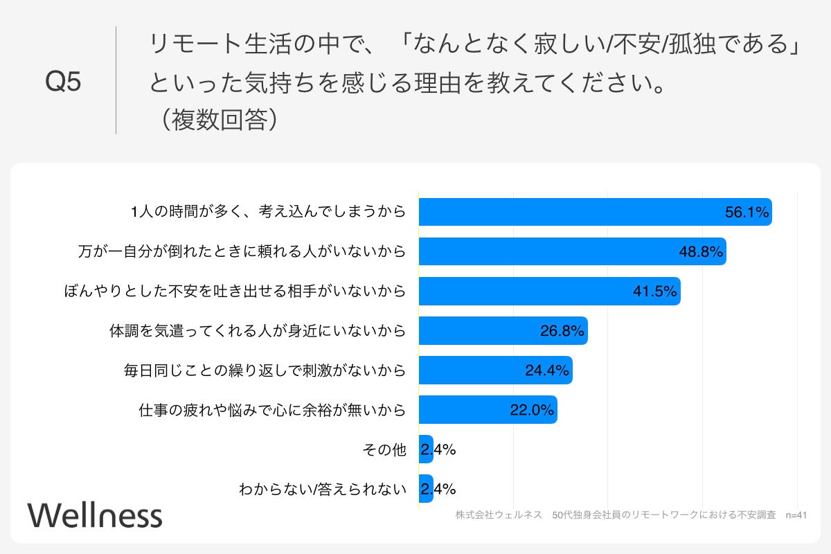 Q4で「よくある」「たまにある」と回答した方に、「Q5.リモート生活の中で、「なんとなく寂しい/不安/孤独である」といった気持ちを感じる理由を教えてください。(複数回答)」(n=41)と質問したところ、「1人の時間が多く、考え込んでしまうから」が56.1%、「万が一自分が倒れたときに頼れる人がいないから」が48.8%、「ぼんやりとした不安を吐き出せる相手がいないから」が41.5%という回答となりました。