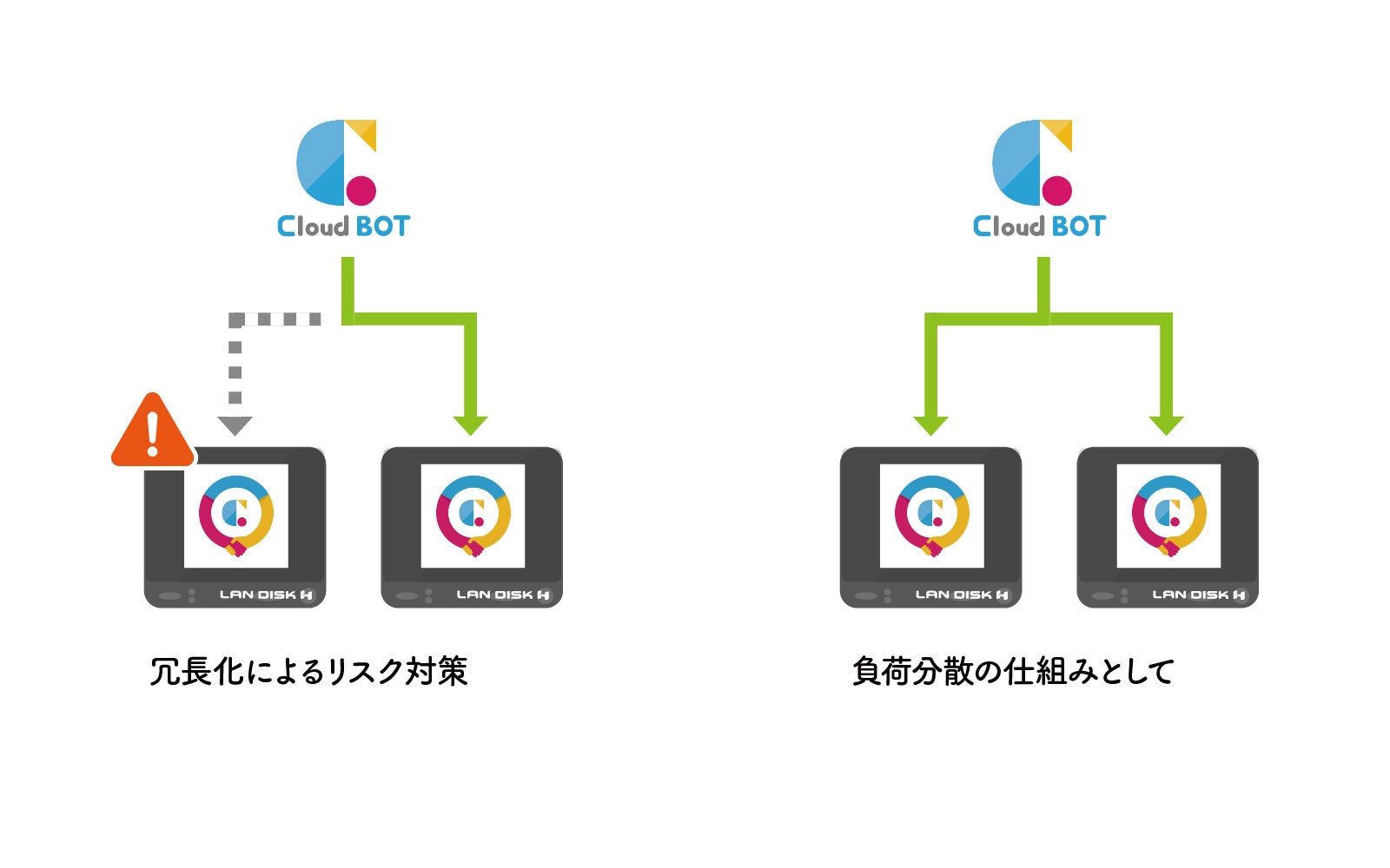 LAN DISKを複数台設置する事で、Cloud BOT Agentをクラスタ化する事が可能です。RPAによる自動化が運用フェーズに入っている場合など、自動化停止のリスク対策として活用頂けます。また、一度に複数のロボットを実行するようなケースでは、1台のLAN DISKの実行上限数を越えロボットの実行が制限される可能性があります。このようなケースでもクラスタ構成にする事で、複数台のLAN DISK で分担してロボットを実行する負荷分散の効果が期待できます。