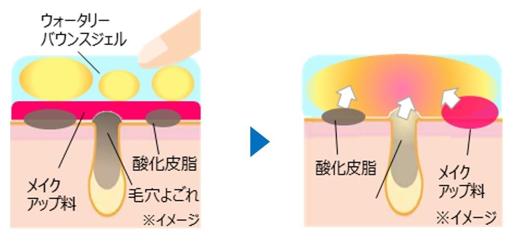 グリセリンなどの粘度の高い保湿剤で構成された水系ジェルにオイルを大量に入れて乳化し、クッション性のあるオイルジェル=「ウォータリーバウンスジェル」に。ぷるんと厚みのあるジェルがバファリング効果※2を発揮し、指が肌に直接触れにくいため、こすらずやさしくなじませるだけで、摩擦感が少なくなめらかに伸び広がります。