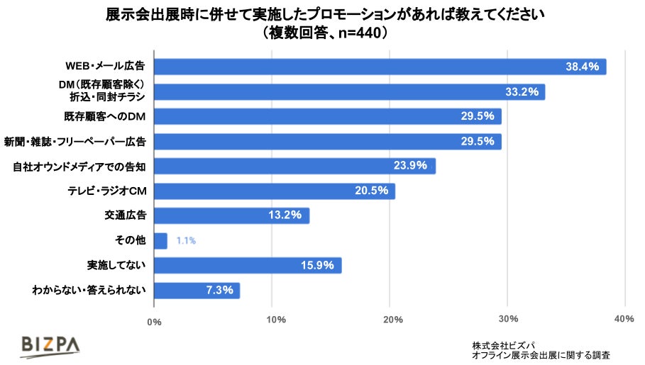 - 併せて実施したことがあるプロモーション、「WEB広告・メール広告」が38.4%で最多。70%以上が出展効果を高めるためのプロモーションを実施