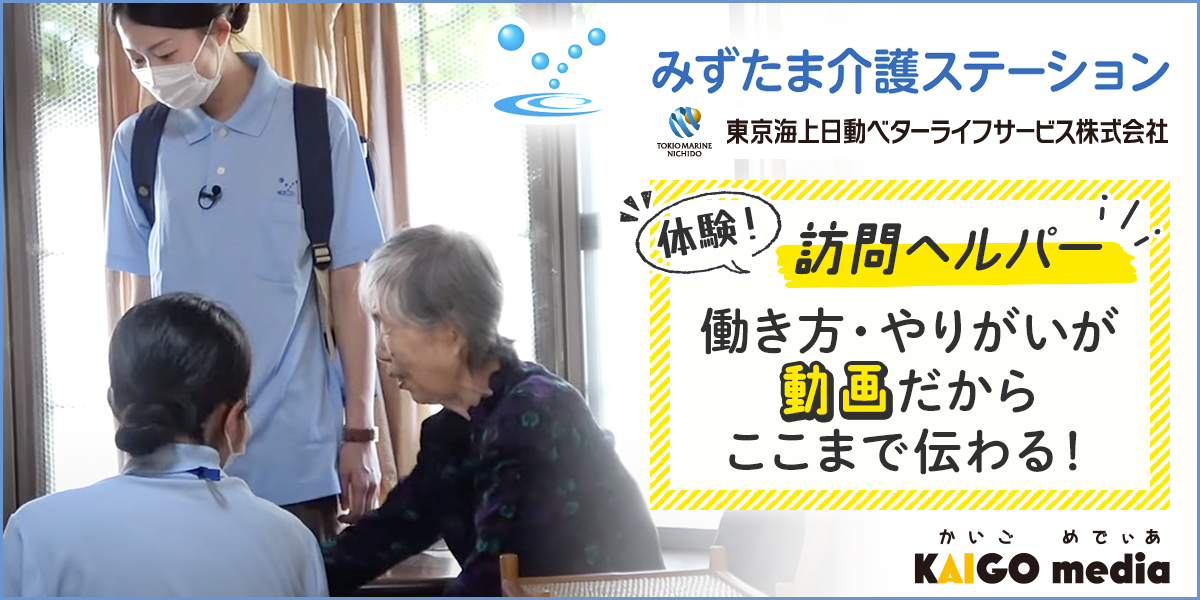 介護領域に特化した動画・SNSメディアを運営する株式会社カイゴメディア(本社:東京都渋⾕区、代表取締役:向笠 元、以下カイゴメディア)ではこの度、東京海上日動ベターライフサービス株式会社(本社:東京都世田谷区、代表取締役:中村 一彦、以下東京海上日動ベターライフサービス)が運営する在宅介護サービス『みずたま介護ステーション』での訪問介護の様子を、介護職の方による体験動画として制作いたしました。訪問介護における懸念を解消し、介護職における新たな魅力ある選択肢のひとつとしてご提案することに貢献いたしました。