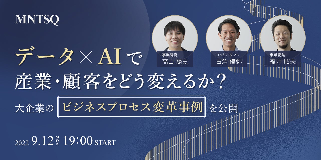 MNTSQ株式会社の高山聡史(事業開発)、 古角優弥(コンサルタント)、福井昭夫(事業開発)が、大企業のビジネスプロセス変革事例につき、ディスカッションを交えてご紹介していきます。