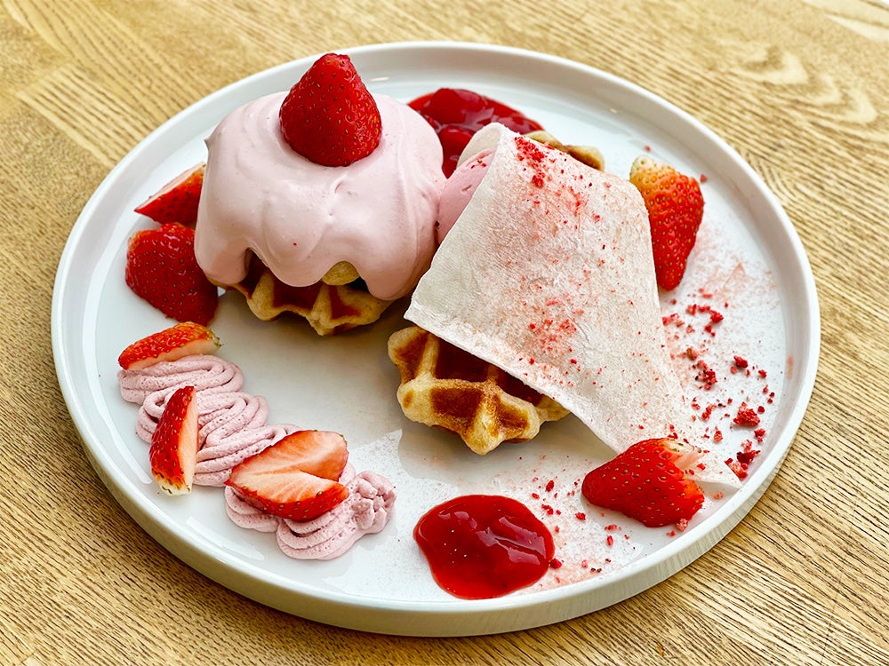 大人気食パンムーをワッフル型で焼いた「ムッフル」を期間限定であまおう苺と合わせた贅沢なワンプレート。自家製苺クリーム、ごろっと苺ソース、求肥、ドライベリー、苺パウダー、自家製苺モンブランクリーム、苺アイスをトッピング。