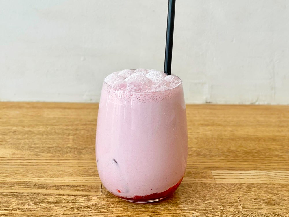 自家製いちごジャムの果肉と練乳がたっぷり入った甘めのミルクが相性抜群!シェイクすると可愛いピンク色になってキュート!