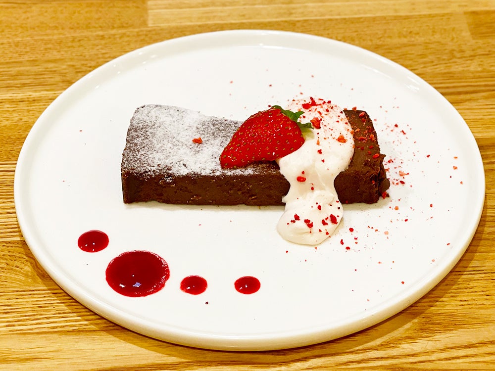 ビターで濃厚なチョコレートチーズケーキに、あまおう苺、自家製苺クリーム、ドライベリー、粉糖をトッピング。ベリーソースをつけながらお召し上がりください。