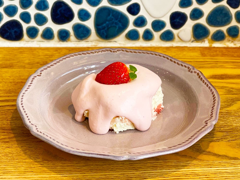 当店人気のオリジナル食パン「ムー」に苺シロップ、あんずのお酒を染み込ませました。自家製苺クリーム、あまおう苺、ミントをトッピング。エスプレッソは使用しておりません。