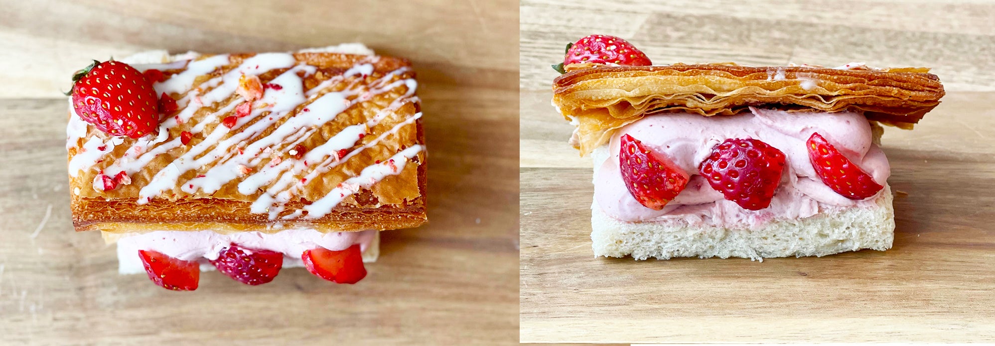 上下のパンが一致してないから不イッチ。今回パンはメープルマスカルポーネパンを使用し、パイには大胆にいちごを飾りました!それだけじゃなく中にもクリームにもいちごをたっぷり使用しています!ぜひご賞味あれ。