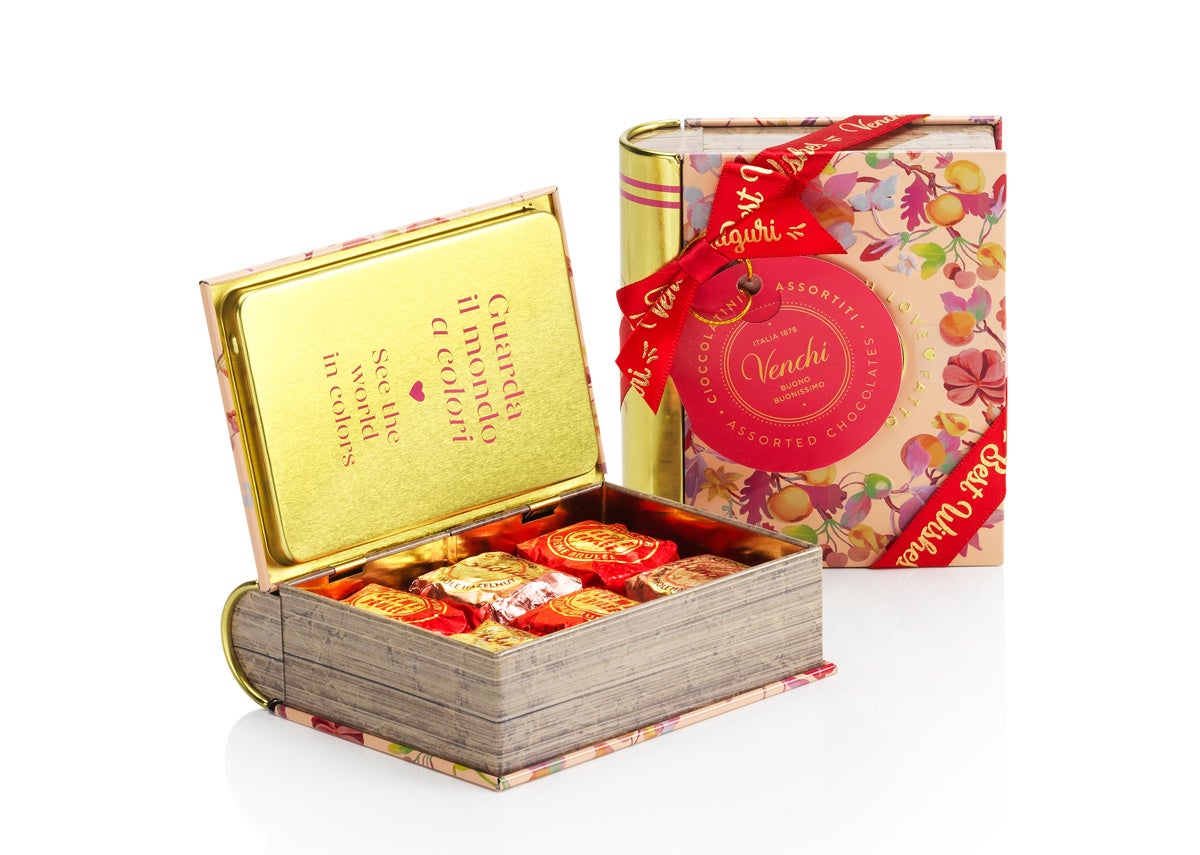 華やかなブック型の缶はエンボス加工が施されたこだわりのデザイン。キャビアのような細かいチョコレートをまぶした「チョコビア」2種をアソート。