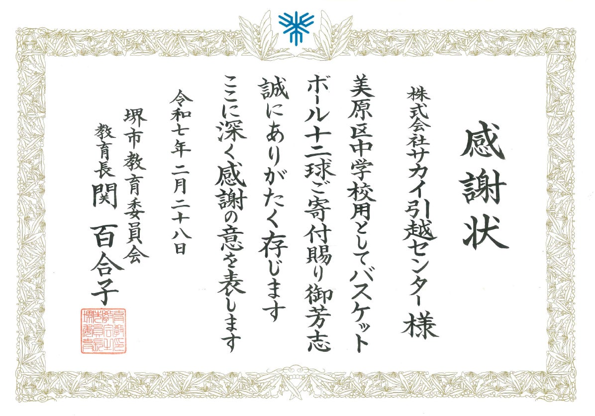 サカイ引越センター バスケットボールを寄贈し堺市教育委員会より感謝状をいただきました
