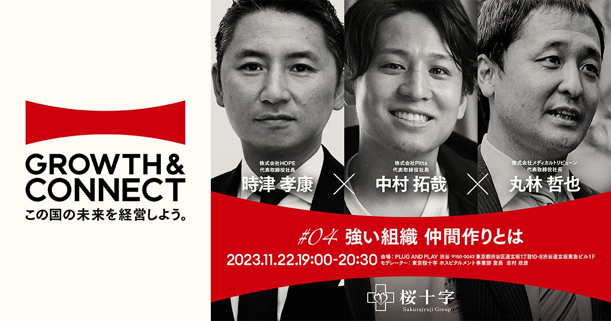桜十字グループでは、2023年8月よりトークセッションイベント『GROWTH & CONNECT この国の未来を経営しよう。』を開催しています。4回目の開催となる今回は、『強い組織 仲間作りとは』がテーマとなり、弊社からは代表中村が登壇いたします。