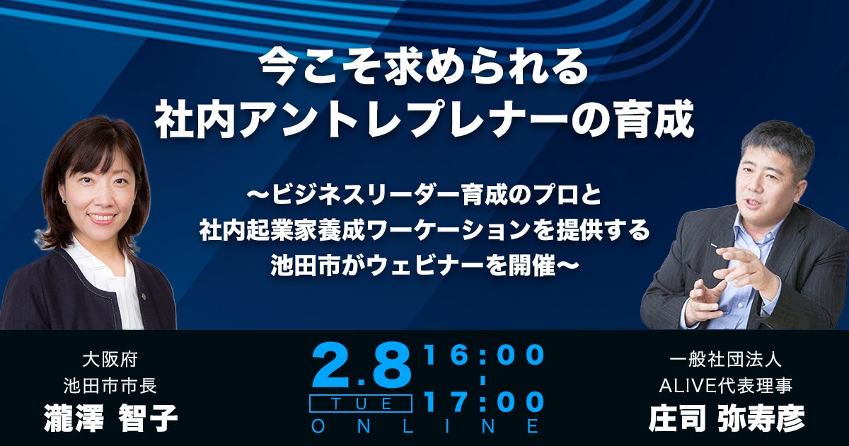 【ウェビナー開催!2月8日16:00‐17:00】人材育成担当必見!今こそ求められる社内アントレプレナーの育成~ビジネス人材育成のプロと社内起業家養成ワーケーションを提供する池田市がウェビナーを開催~