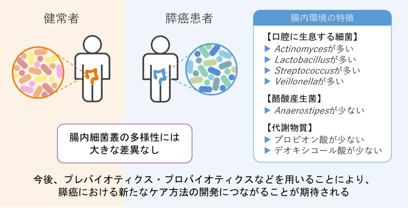 これらの結果から、膵癌患者は健常人と比較して腸内環境が大きく損なわれているわけではないものの、特定の細菌群に違いがあることが明らかになりました。本研究成果は、膵癌の病状や予後などにこれらの細菌が関与する可能性を示唆しており、これらの細菌をターゲットとしたプレバイオティクスやプロバイオティクスによる介入が、膵癌の新規メカニズム解明や治療方法の開発につながることが期待されます。
