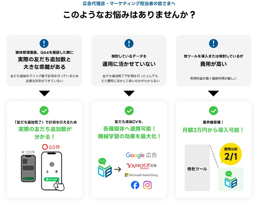 従来のタップ計測に依存せず、実際の「LINEの友だち追加」を計測し、そのCVデータを広告媒体と連携することで、運用効果を最大限に引き出します。業界最安値の月額3万円から導入可能です。