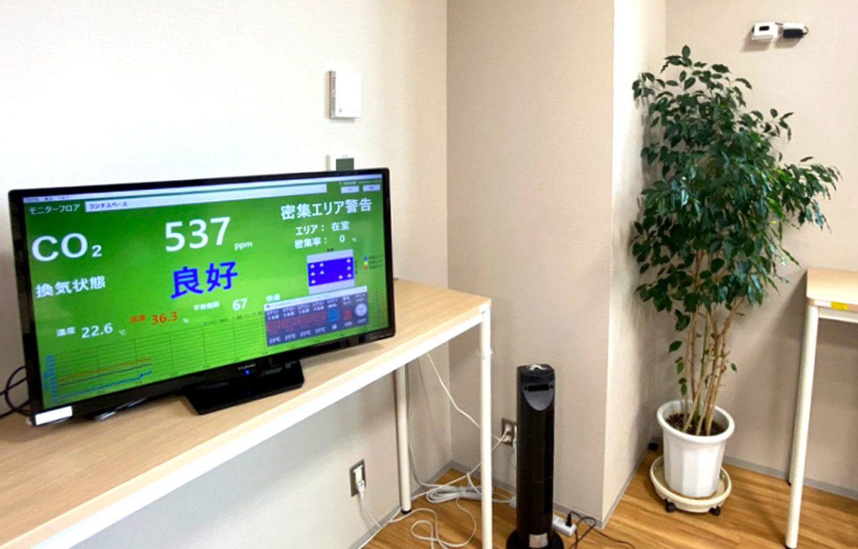 センサーシステムは、グループ企業グローバルマイクロニクス株式会社金沢工場(以下、金沢工場)の食堂スペースに設置されており、そのモニタリング情報をリアルタイムで表示しております。