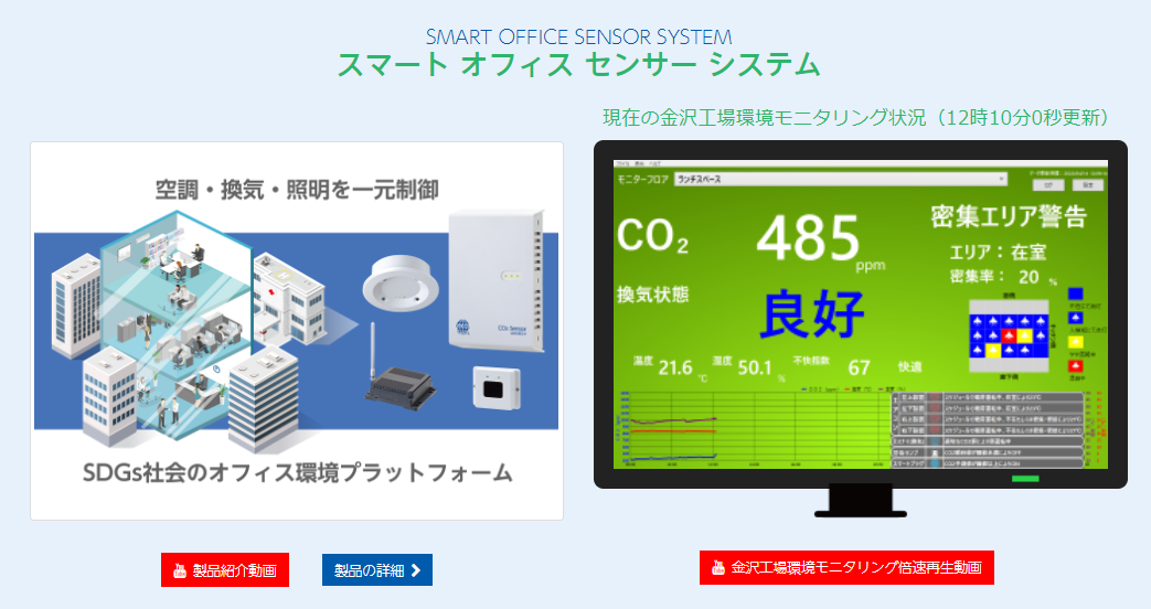 金沢工場建屋のCO2濃度、人の密集、空調機器制御などのモニタリング情報をウェブサイトでライブ公開│人にやさしい労働環境と自社センサーシステムの機能をアピール