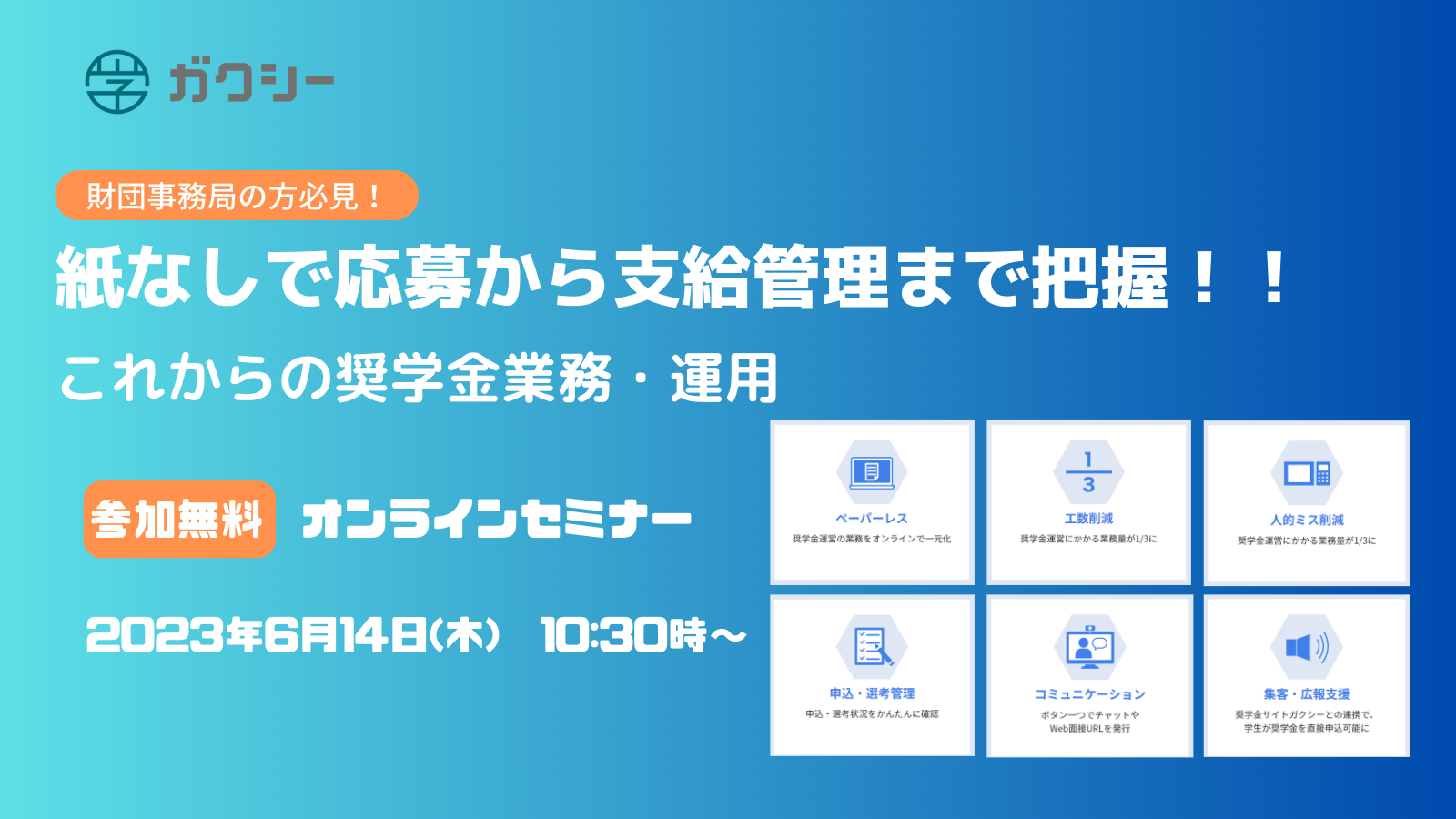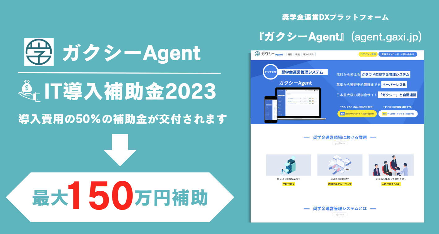 (https://agent.gaxi.jp/)を運営する、株式会社ガクシー(本社:東京都港区、代表取締役:松原良輔)では、経済産業省が実施する「IT導入補助金2023」に、奨学金の運営団体向けの管理システム『ガクシーAgent』が採択されたことをお知らせします。これにより、『ガクシーAgent』の導入費用の2分の1(最大150万円)が補助金対象となり、書類やエクセルなど、アナログな運営・管理が主体の奨学金運営団体におけるIT投資の負担が軽減されます。