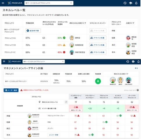 今回PROEVERでは、2021年2月にリリースした「プロジェクト成功率予測」および 2021年10月にリリースした「スキル診断」の情報を活用することで、全プロジェクトの「特性」や「求められるマネジメントレベル」を数値化しました。この情報を活用することで、マネジメントメンバー決定時の無理なアサインを減らし、適切なメンバーをアサインすることでプロジェクトの成功率を向上させることができます。