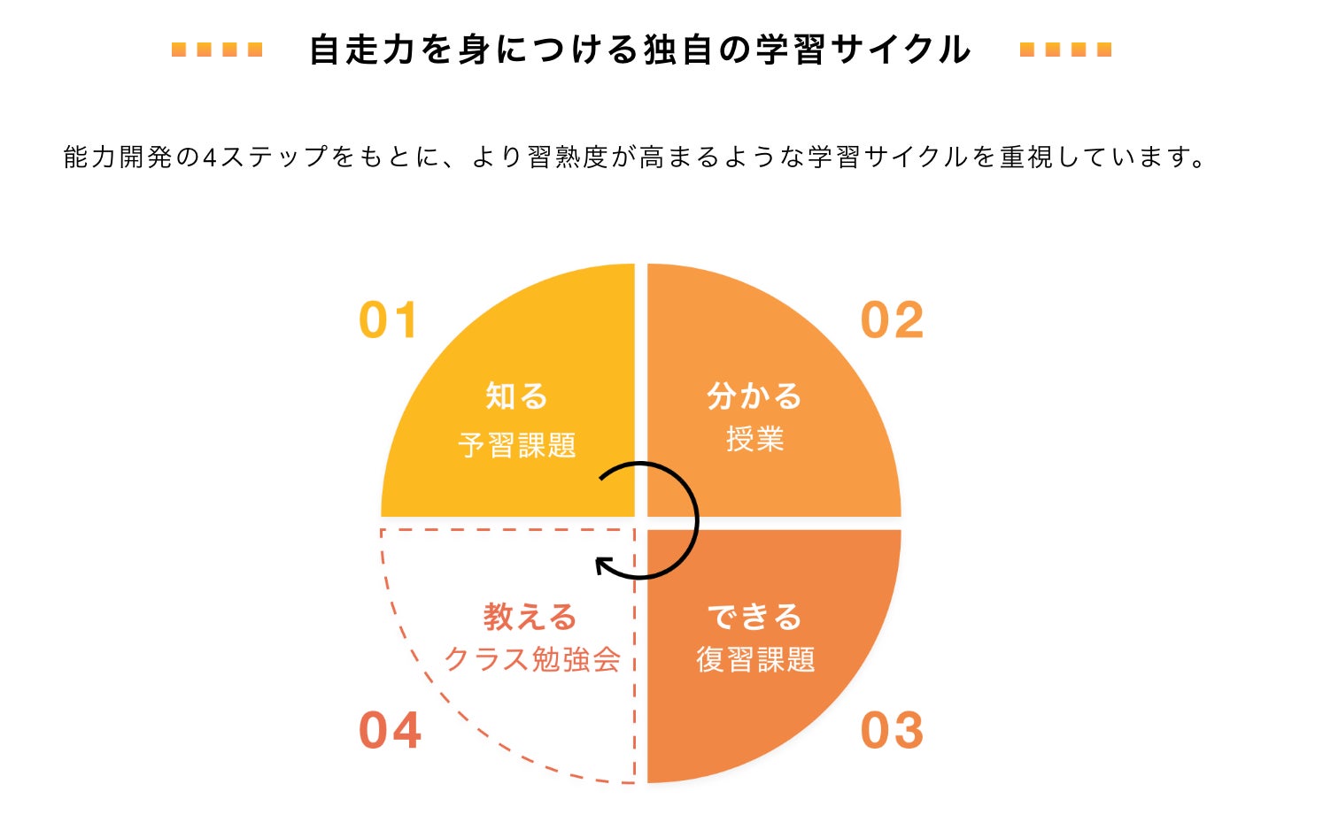 授業で基礎知識をインプットし、課題でアウトプットするという従来型の学習方法とは異なり、課題でインプットし授業でアウトプットするという「反転学習」を導入しており、自走力を身につける独自の学習サイクルで授業を展開しています。