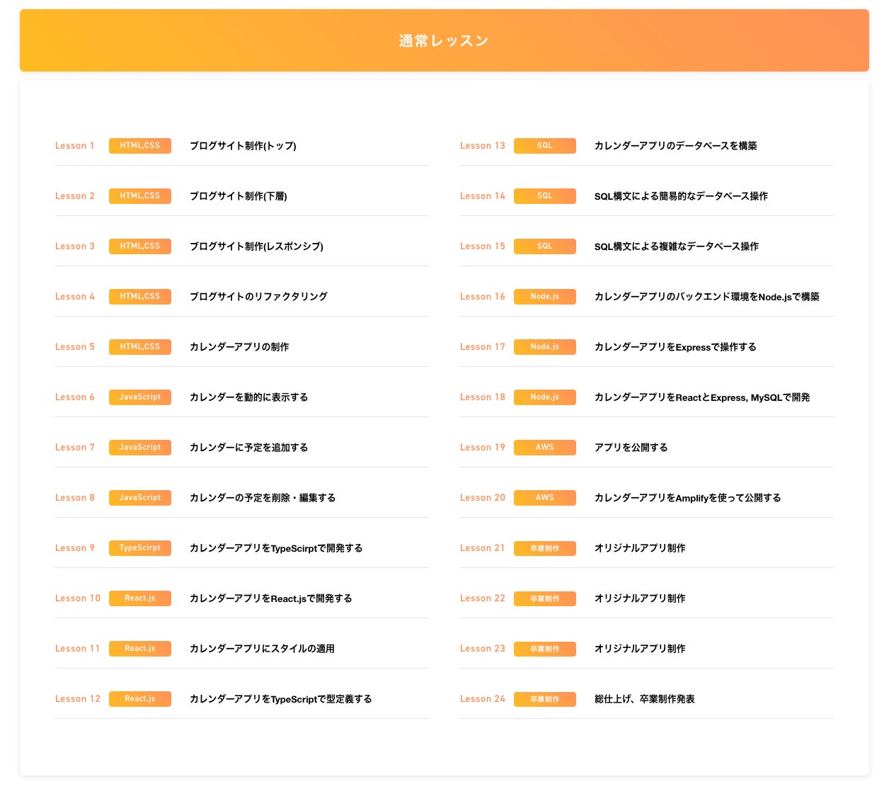 マークアップ、JavaScript、React.jsに加え、要件定義からリリース後の保守運用までを一気通貫して学べるカリキュラムです。