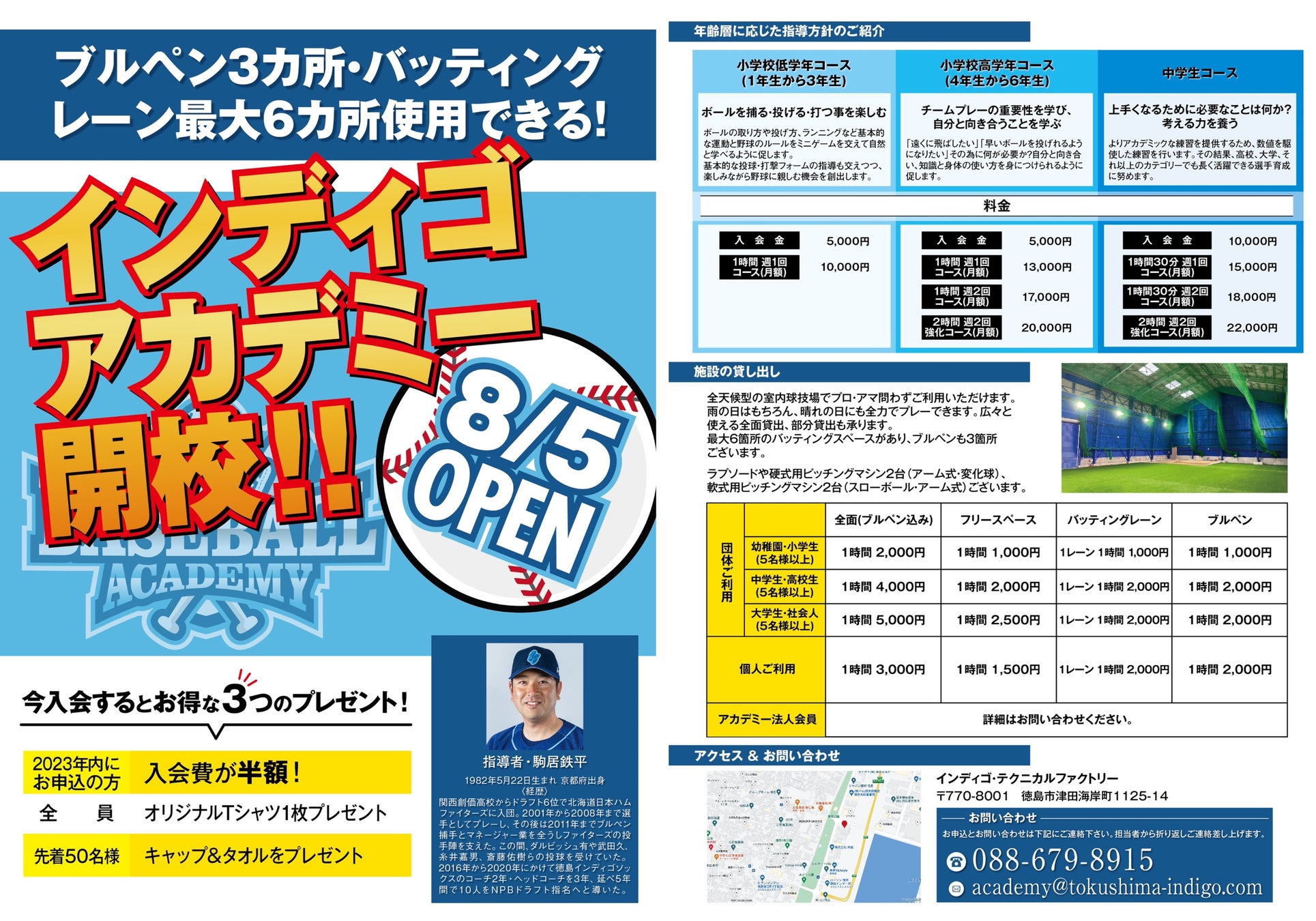 この度、株式会社パブリック・ベースボールクラブ徳島が運営する徳島インディゴソックス球団では、室内練習場をオープンし、野球スクール「インディゴアカデミー」を開校する運びとなりましたのでお知らせ致します。