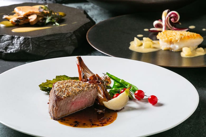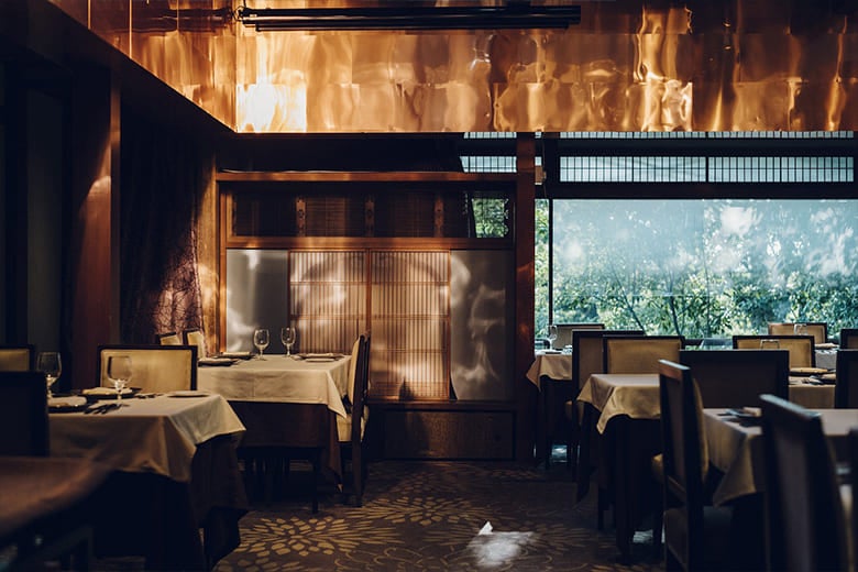 古刹の魅力を体感したあとは、境内と東山の街並みを歩きながら「アカガネリゾート京都東山1925」へ。700坪の広大な森に囲まれたひっそりとした佇まいとは裏腹に、重厚な扉の向こうにある緑と銅が陽光に反射して美しく輝く庭が訪れる人々を魅了します。大正時代の実業家の邸宅を改装した和モダンな隠れ家レストランで、日本の四季の繊細な移り変わりを表す旬の食材を用いたフレンチのランチコースをいただきます。