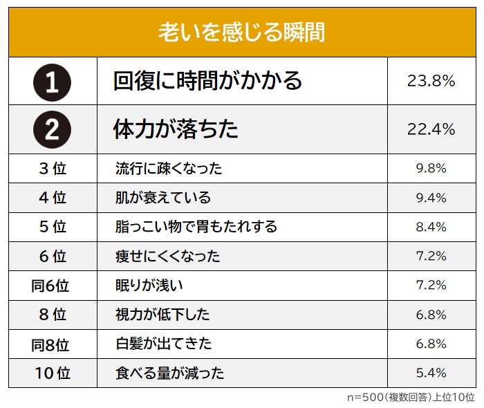 30代以上の男女500人に「老いを感じる瞬間」を聞いたところ、1位は「回復に時間がかかる(23.8%)」、僅差の2位には「体力が落ちた(22.4%)」でした。