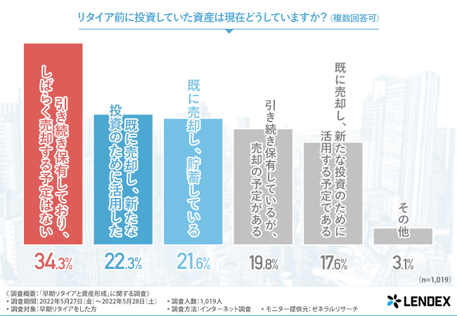そこで、「リタイア前に投資していた資産は現在どうしていますか?(複数回答可)」と質問したところ、『引き続き保有しており、しばらく売却する予定はない(34.3%)』と回答した方が最も多く、次いで『既に売却し、新たな投資のために活用した(22.3%)』『既に売却し、貯蓄している(21.6%)』と続きました。