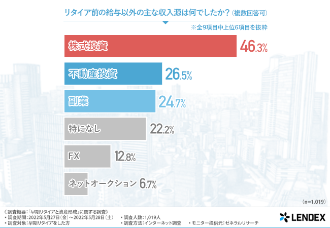 そこで、「リタイア前の給与以外の主な収入源は何でしたか?(複数回答可)」と質問したところ、『株式投資(46.3%)』と回答した方が最も多く、次いで『不動産投資(26.5%)』『副業(アルバイト、クラウドソーシングなど)(24.7%)』と続きました。