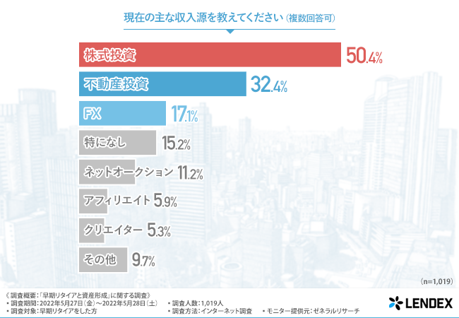 そこで、「現在の主な収入源を教えてください(複数回答可)」と質問したところ、『株式投資(50.4%)』と回答した方が最も多く、次いで『不動産投資(32.4%)』『FX(17.1%)』と続きました。