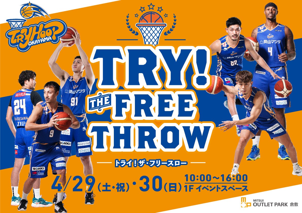 地元・岡山のプロバスケットボールチーム「トライフープ岡山」を盛り上げる、バスケットボールイベントを実施いたします。館内でのお買い上げ5,000円(税込・合算可)ごとに1回フリースローにご参加いただけます。フリースローが成功した方には三井アウトレットパーク共通お買物・お食事券500円分をプレゼントいたします。