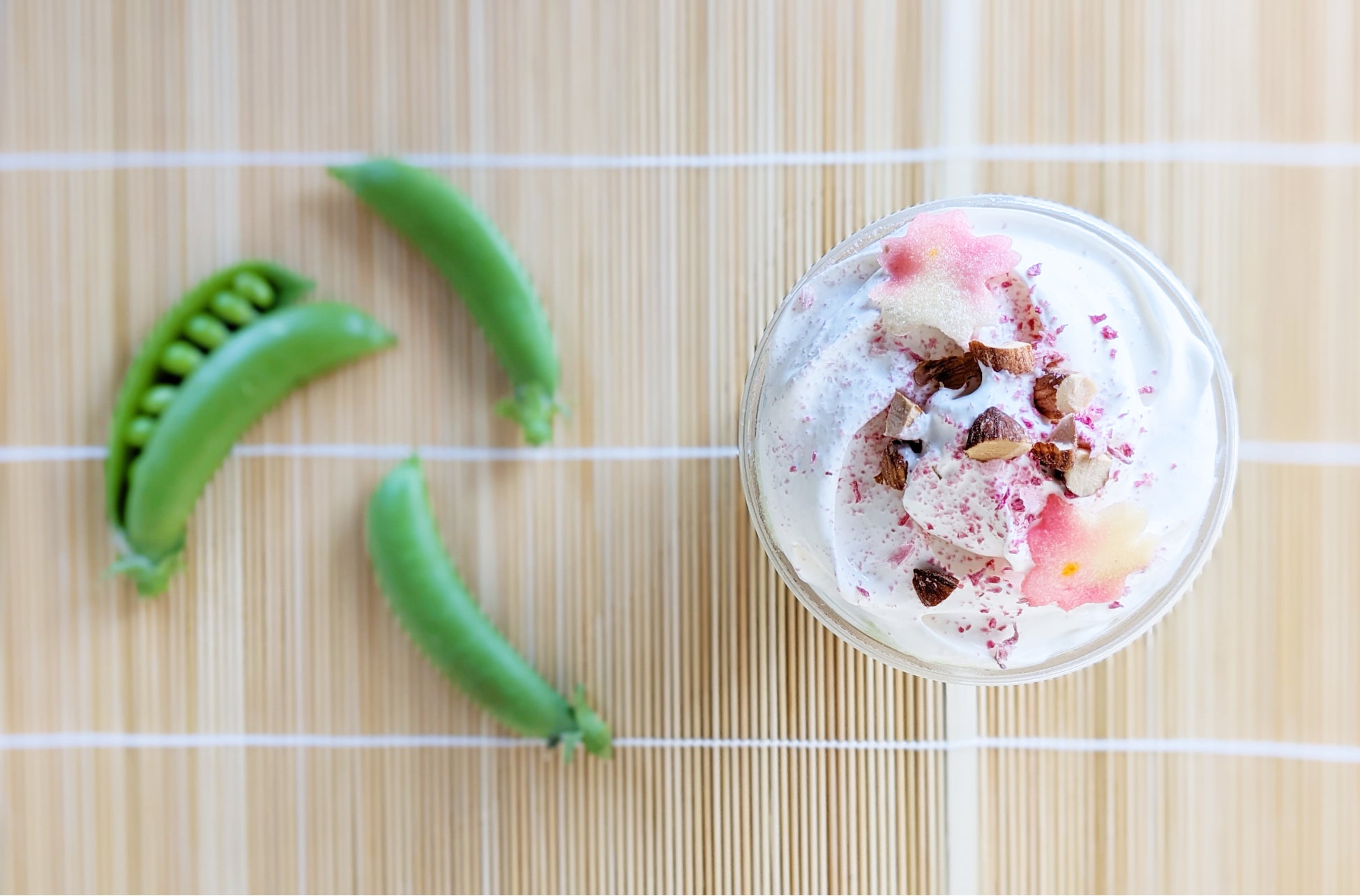 うすい豆と桜で春の彩をイメージした「うすい豆と桜のすりながし」。中の食材にはえんどう豆・海老・たけのこ・ナッツ・桜麩・桜フレーク・桜の香りの豆乳エスプーマを使用しています。春の新作ということで桜をふんだんに使用し、視覚と味覚の両方で春を感じられる一品に仕上げています。