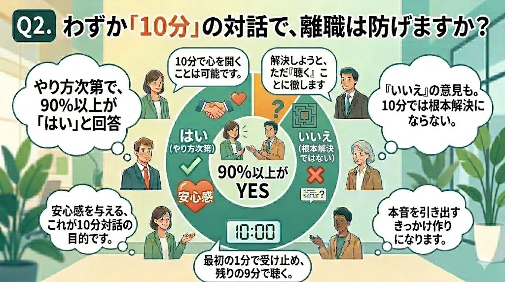 驚くべきことに、プロのコーチの多くが「やり方次第で、10分という短時間でも離職意欲を抑制できる」と回答しています。ただし、その10分は「説得」の時間ではなく、部下の「心理的安全性を確保する」ための時間です。