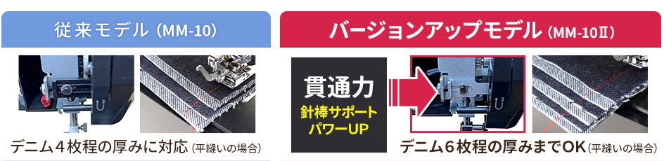 厚布や段差にしっかり針を刺す貫通力を実現し、デニム6枚程度の厚みに対応できます。