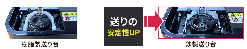 「鉄製送り台」を採用し、従来よりも布送りがスムーズに、また縫い曲がりを軽減。