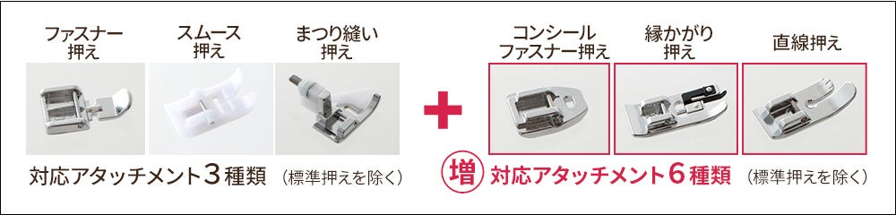 従来の対応アタッチメント3種類から、さらに3種類のアタッチメントに交換することができ、ますますソーイングの幅が広がりました。
